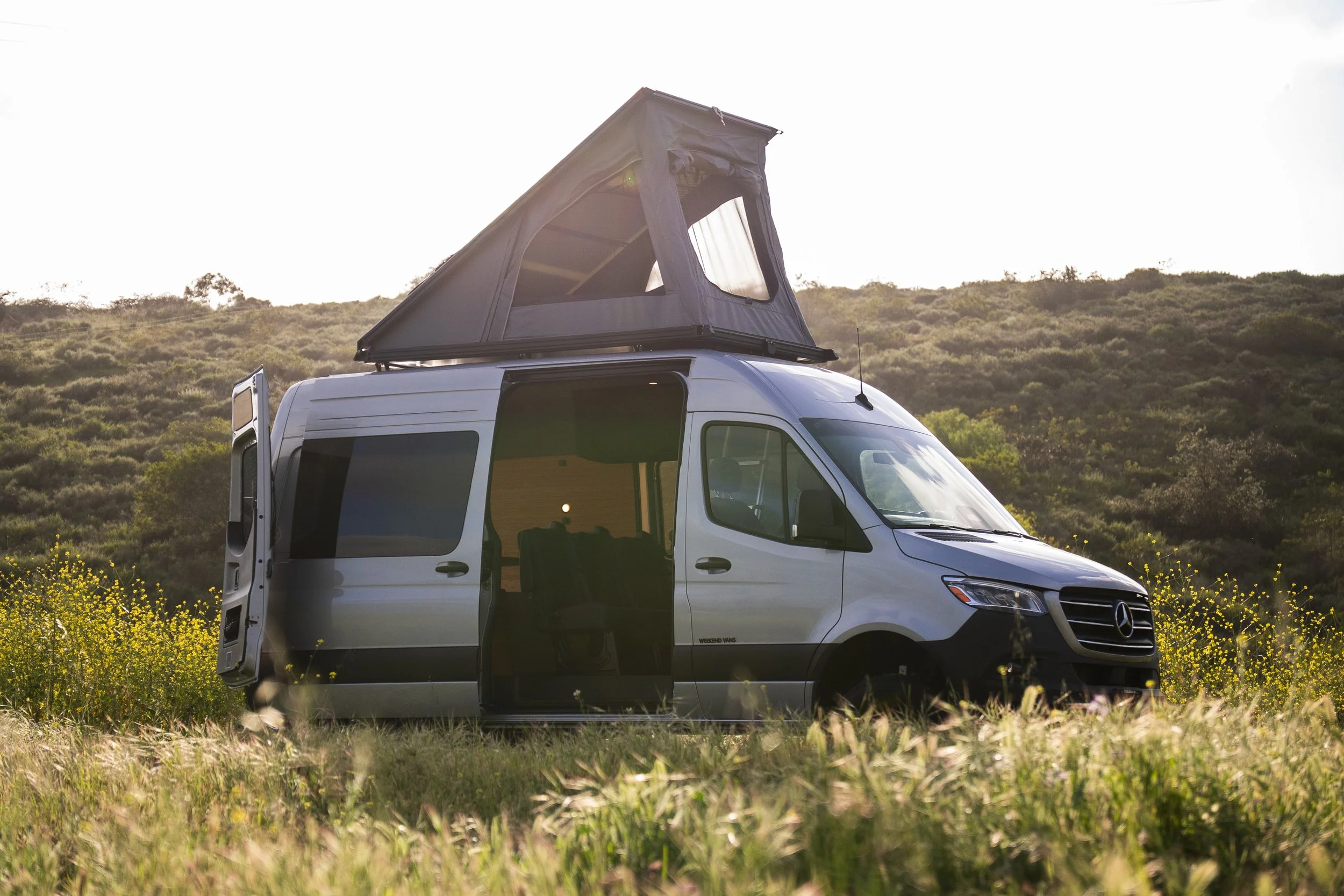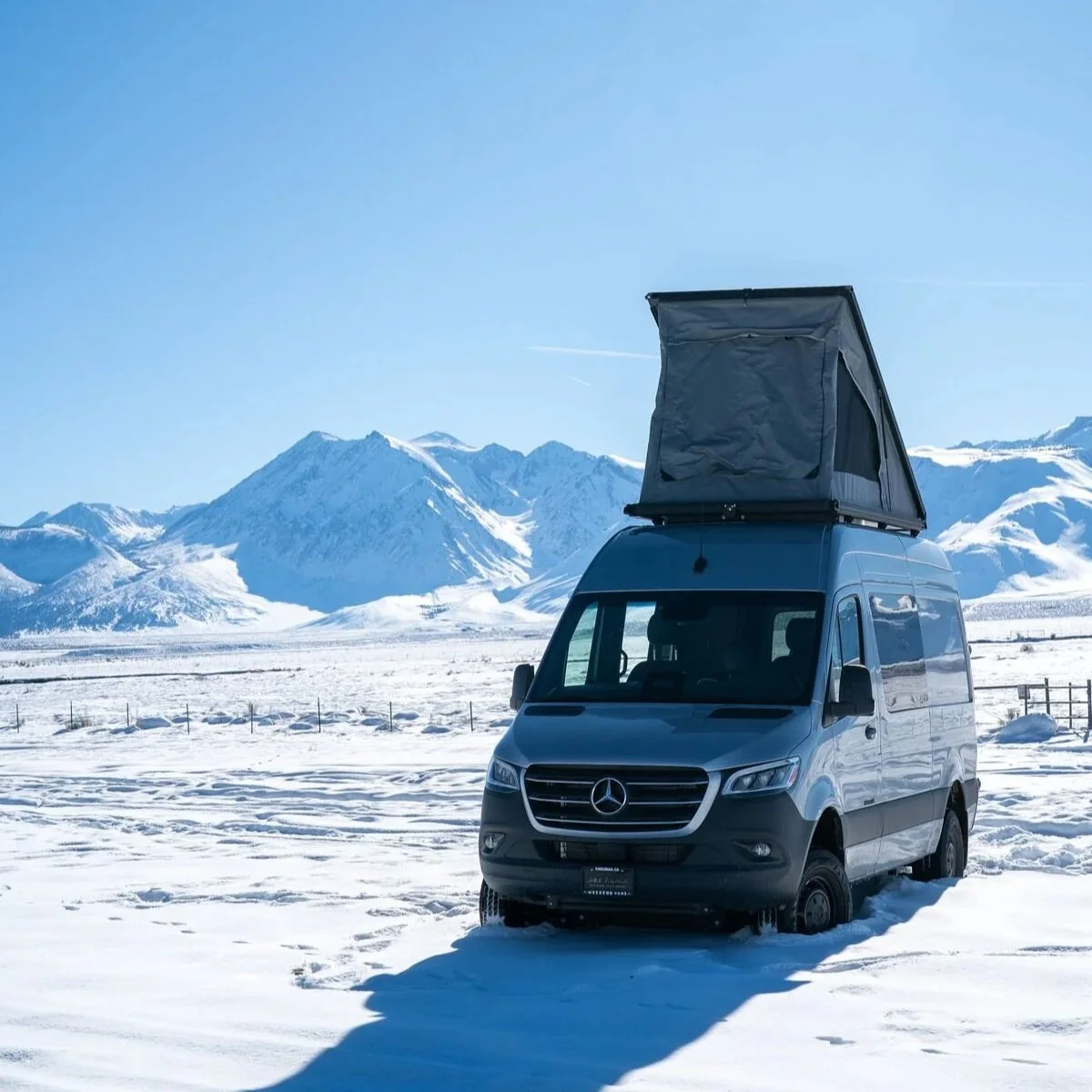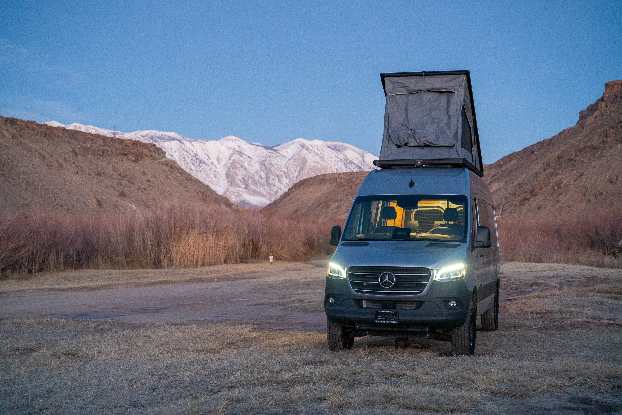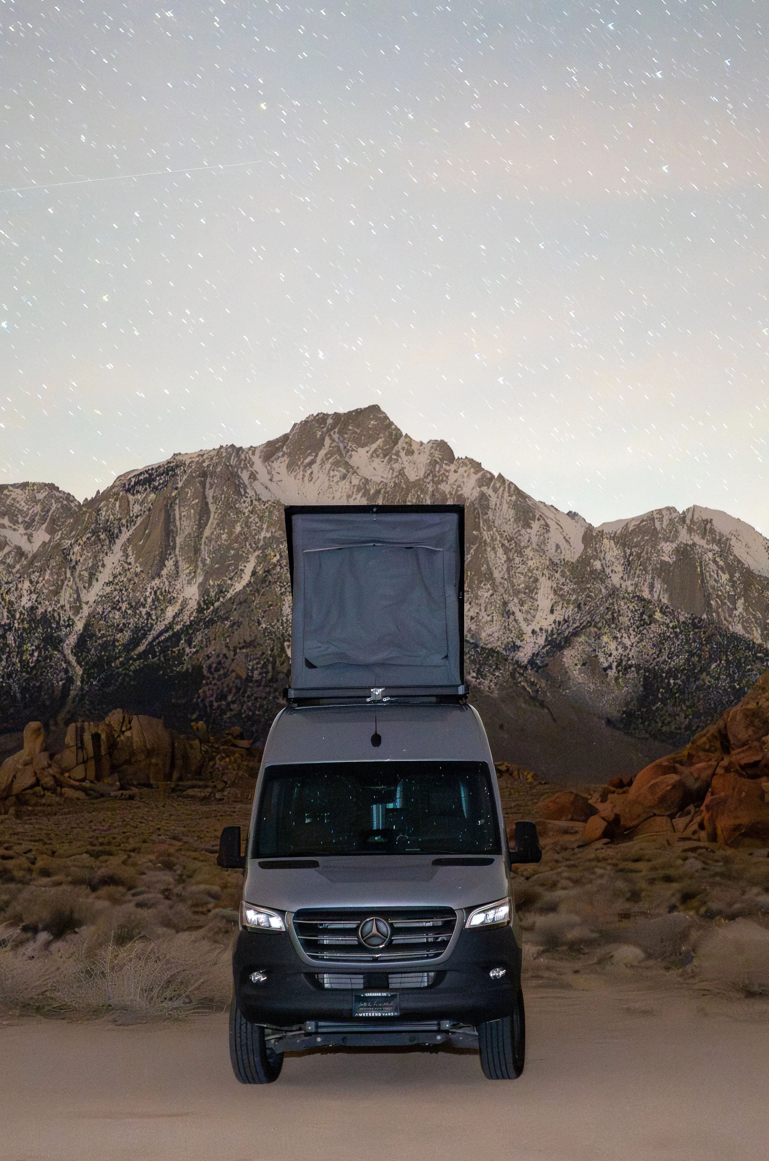 Sleep under the stars in a pop-up rooftop tent, then fold it down and hit the road. The rear dinette seats the whole family for meals and converts to a second sleeping area at night. Built on the Mercedes Sprinter 144 AWD platform — everything you need, nothing you don't.