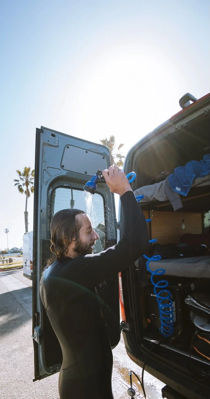 While we think having a shower and sink inside the van is overkill, having a spray nozzle in the back of the van to wash sand off of your kids’ feet or a dirty mountain bike is pretty great. Add the fact that a propane tankless hot water heater can get that shower to 120 degrees, and you have a recipe for a delightful post-surf shower.